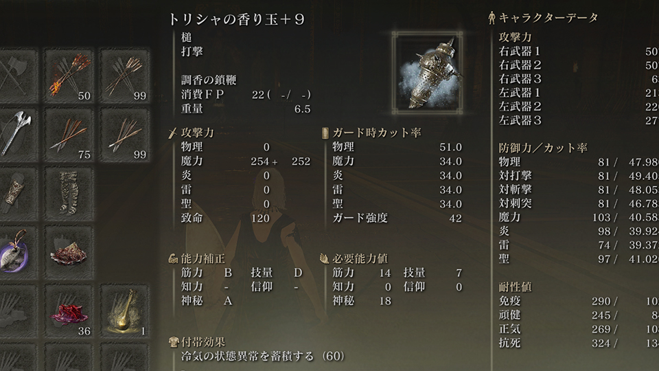要求値も筋力14、技量7、神秘18と、神秘以外は初期値で満たす素性も多く、神秘に少しだけ振ってやれば幅広いビルドで使うことができる汎用性が高い一本