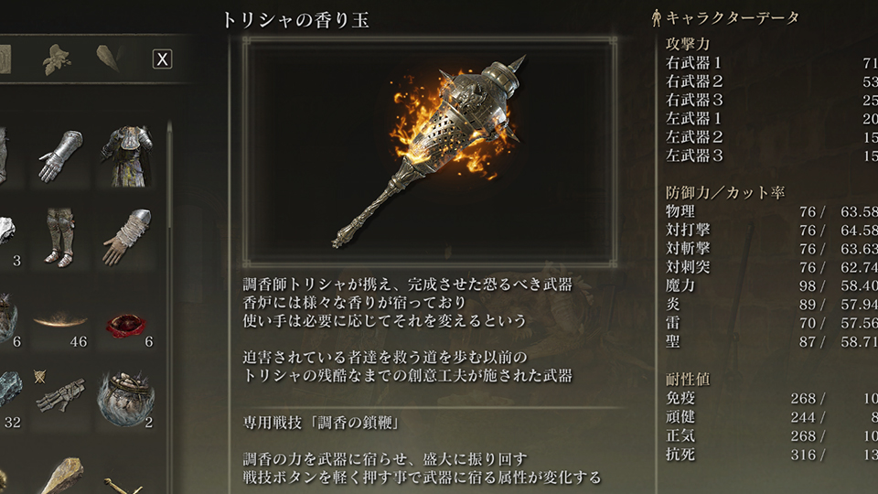 モンハンの「アルバトリオン」みたいに自身の属性をコロコロ変えてくるような敵、あるいはボスがいたら特攻、「トリシャの香り玉が最適解!」みたいになっただろうなと思う