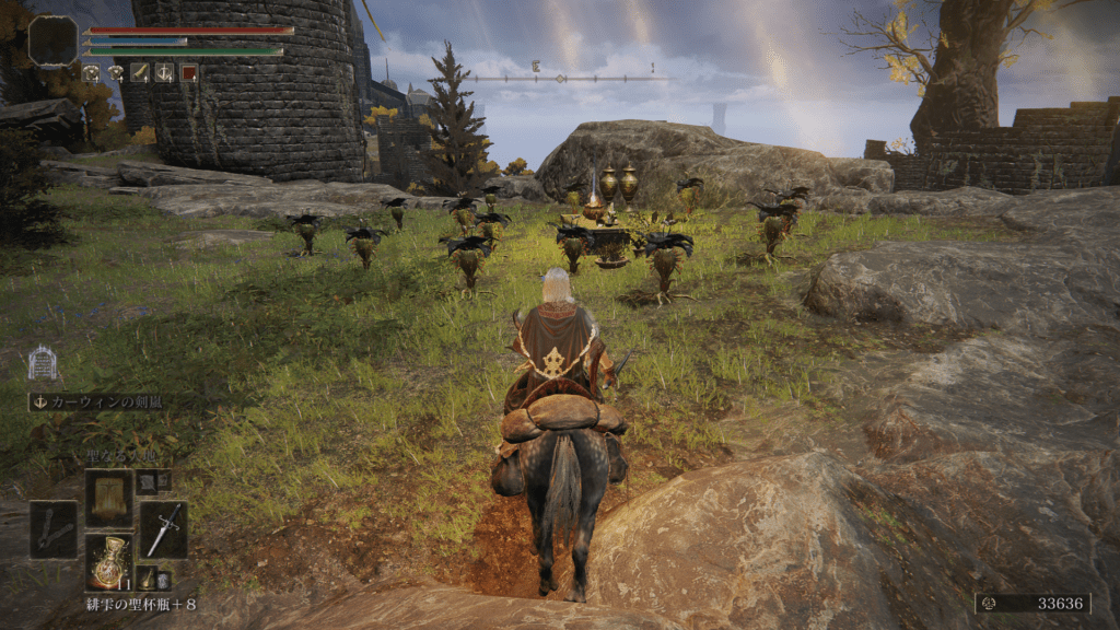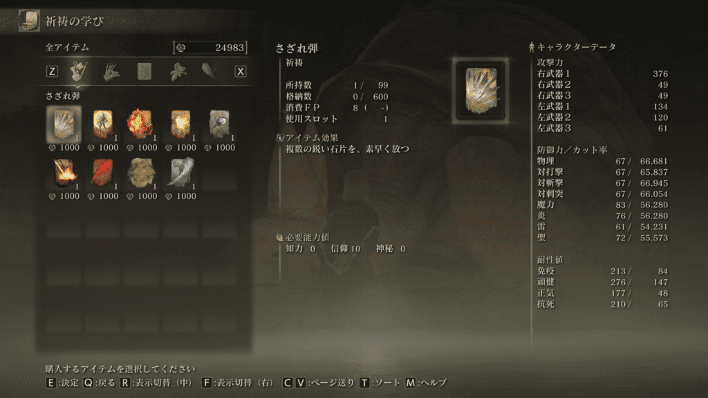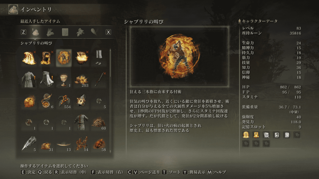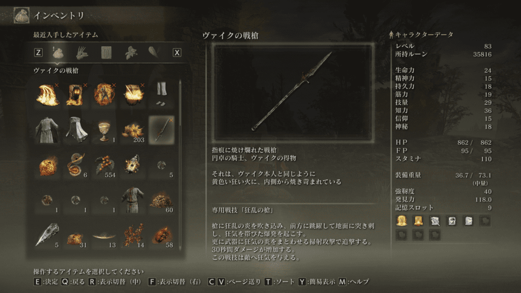通常モーションが少しもっさりしてるけど、知力・信仰に補正が無いから、以前手に入れた「修験者の腕輪」の能力「行動速度を10%」と組み合わせると快適になるかもしれない