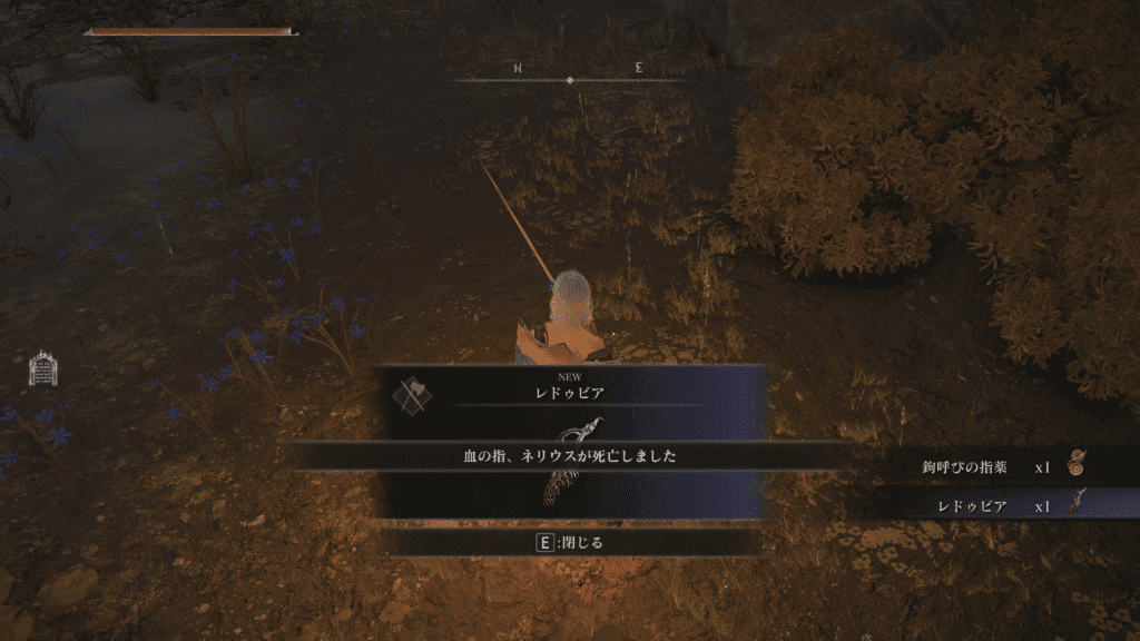 戦技「霧の猛禽」はとっておきたいので、イベントを進めるべく「血の指、ネリウス」を倒すためにアギール湖を北上