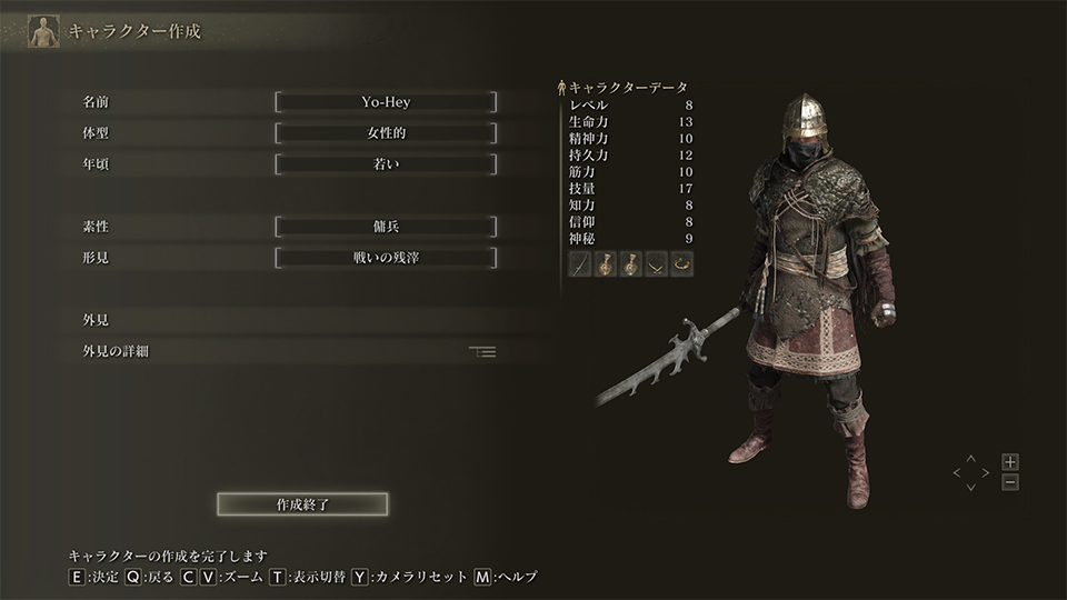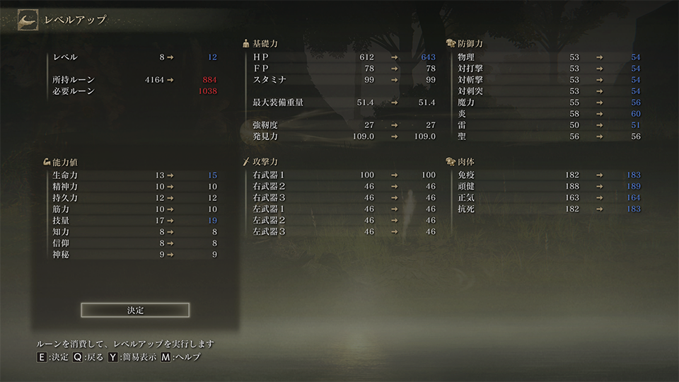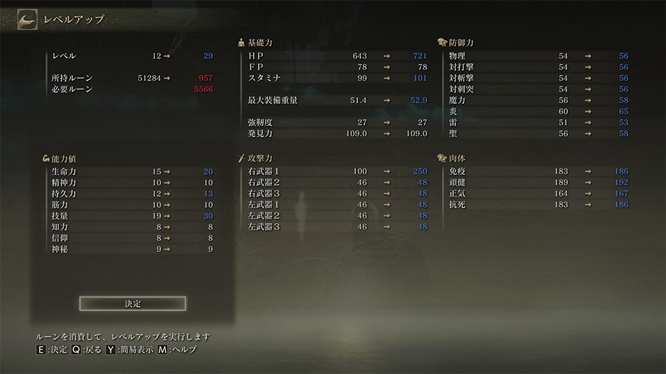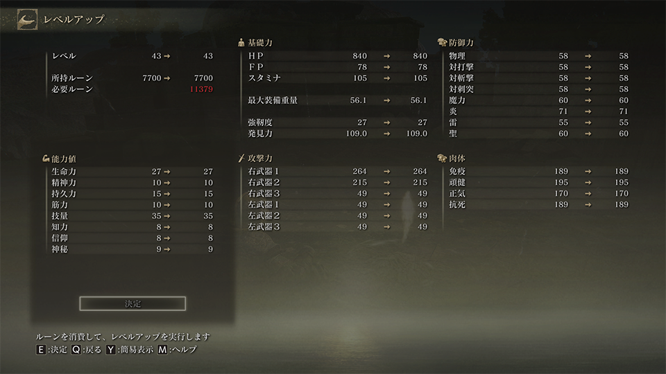 生命力・持久力にもバランスよくステータスが振られ、逆に知力・信仰・神秘は非常に控えめ