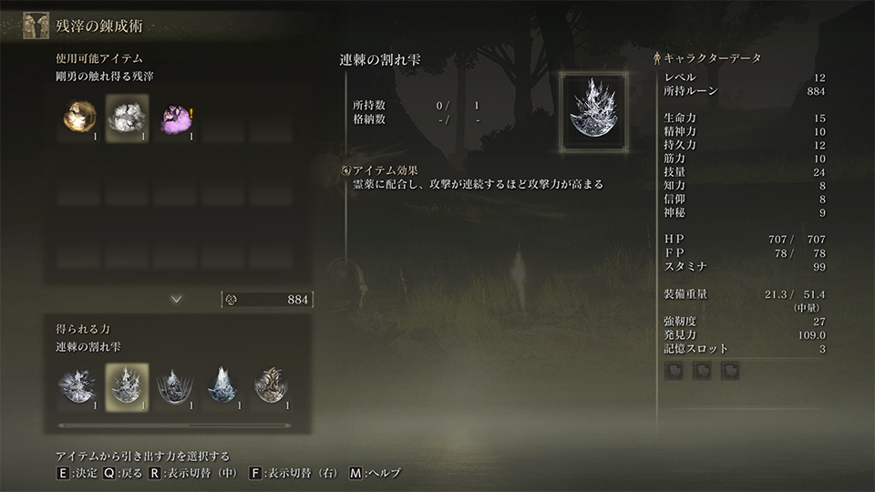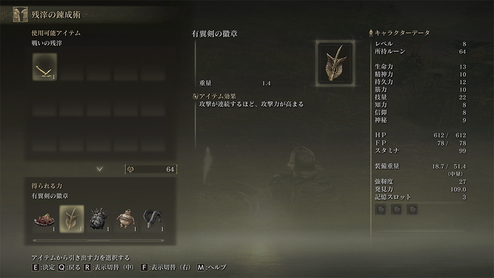 コンバージェンスでは知力・信仰に補正がある武器が強いため、技量特化の素性はやや不遇な感はあるものの、技量と相性の良い手数武器はコンバージェンスでも強力