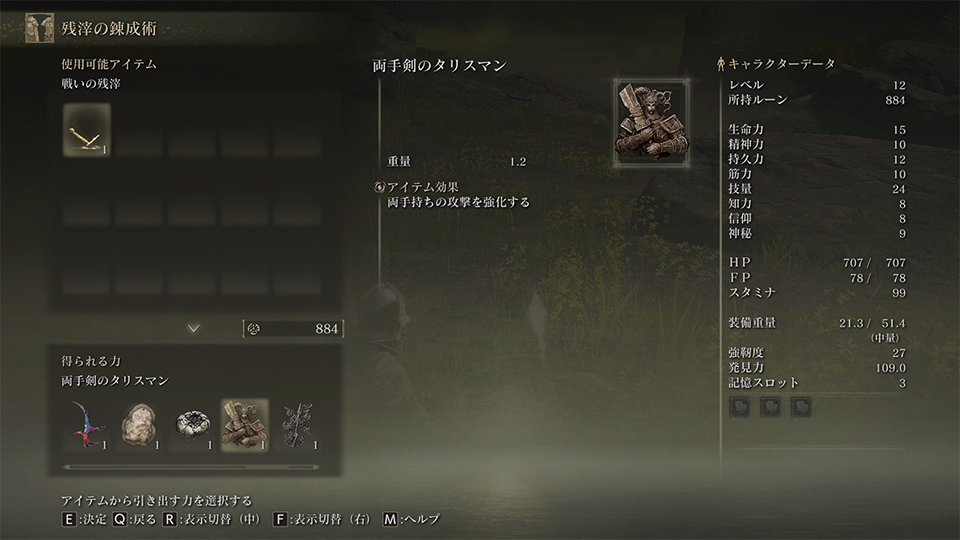 後々は使わなくなるけど、今はメイン武器が両刃剣なので、少しでも火力を上げるために「両手剣のタリスマン」と交換