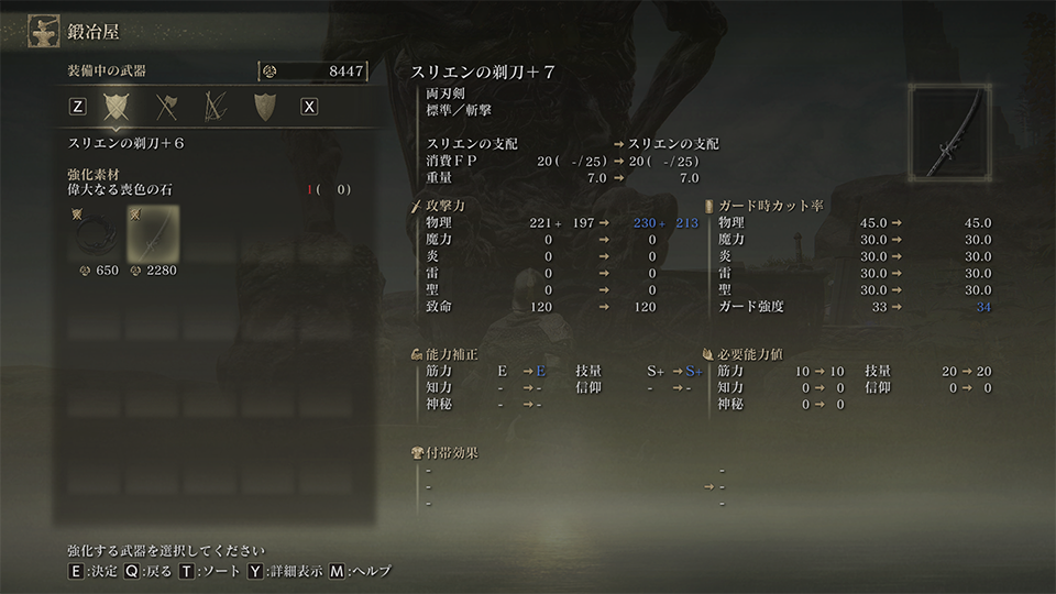 ここまで集めた鍛石と、「イジー」から購入できる鍛石を合わせて、「スリエンの剃刀」を6まで強化
