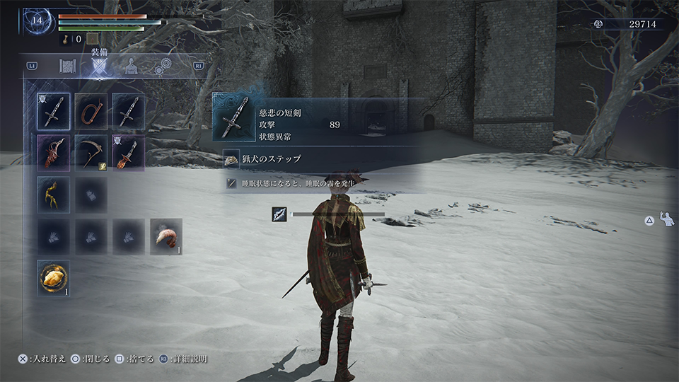 右手は「犬ステ」短剣で固定、戦闘開始直後は「蠍の針」、腐敗が入ったら「レドゥビア」に切り替えて出血を狙っていく